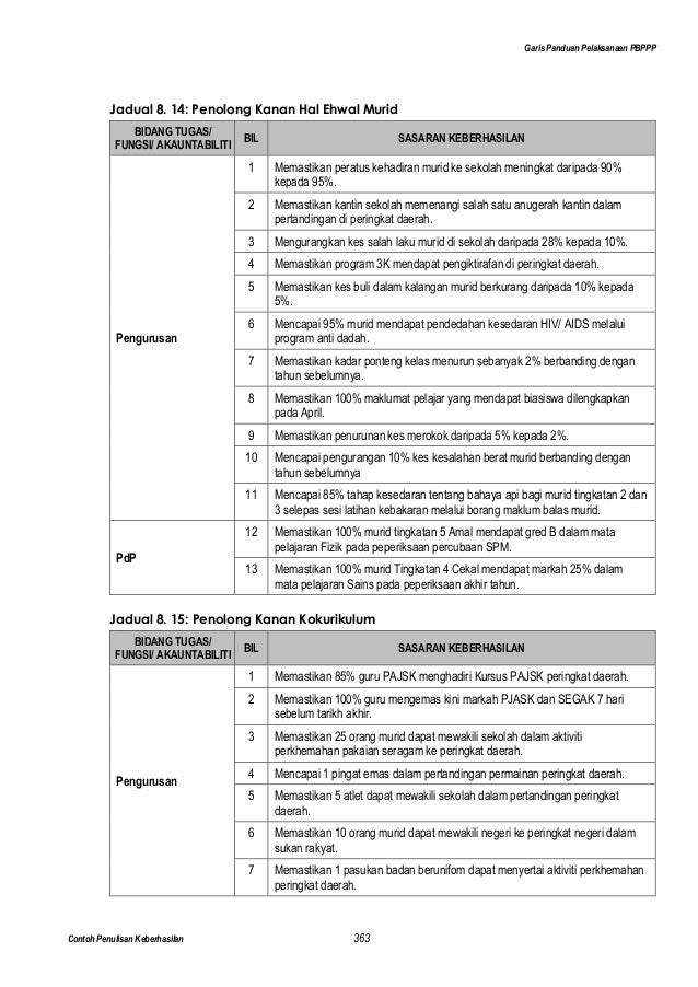 Contoh-contoh sasaran keberhasilan disediakan adalah mengikut jawatan dan skop tugas PPP.